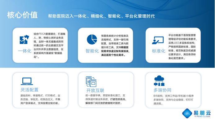 本項目基于易朋云HRP醫(yī)院綜合運(yùn)營智慧管理平臺,覆蓋醫(yī)院HRP“人、財、物”領(lǐng)域的業(yè)務(wù)模塊。圍繞“業(yè)務(wù)融合一體化”思想,融合醫(yī)院整體發(fā)展的指導(dǎo)戰(zhàn)略思想與方法論,主要內(nèi)容包含以下幾方面: